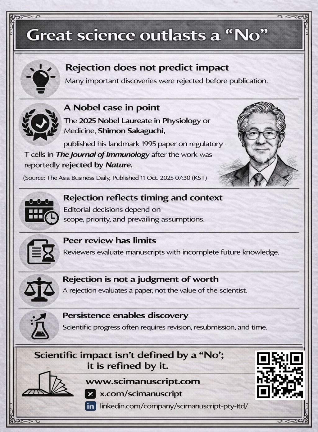 While the exact circumstances of some historical rejections are debated, rejection does not always predict future impact. Take the case of PCR. Manuscripts involving this technique were initially rejected by both Science and Nature. However, the technique ultimately revolutionized molecular biology. Similarly, Lynn Margulis’s work on endosymbiosis was rejected by over a dozen journals. Her work eventually reshaped our understanding of cell evolution. Finally, take the case of Shimon Sakaguchi, the 2025 Nobel Laureate in Physiology and Medicine. His landmark 1995 paper on regulatory T cells was published in The Journal of Immunology after the work was reportedly rejected by Nature.